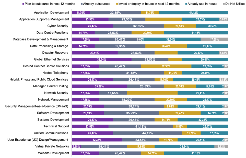Moves among global enterprises to allocate more IT functions to third-party providers is a contributing factor in Emerging Europe’s rise as a global ITO delivery hub. Global ethernet services (38.24%) and managed server hosting (35.29%) are the top IT functions that will be outsourced over the next 12 months, as global enterprises look to reduce on-premise IT costs.